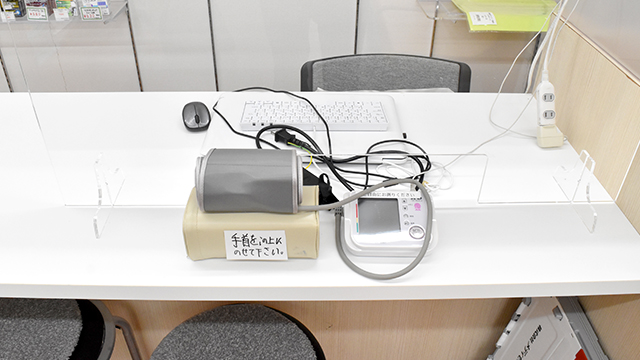 待合室には血圧計を導入し、毎日の健康チェックに利用していただいたり、お薬や健康についての疑問や質問に答えられるよう相談コーナーを設けております。